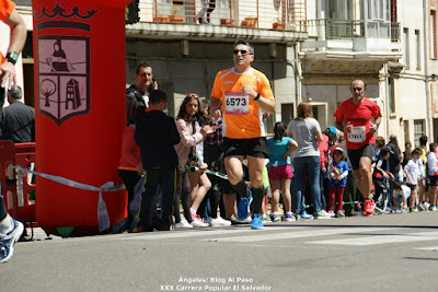 Entorno al 2,5 salimos del pueblo, por la larga recta que nos llevará a Gavilanes, por la carretera, siguiendo la línea del arcén, en fila india, llevando un ritmo cómodo, por debajo de 5 min/km, ánimos de vez en cuando, voy sólo, Alicia ya se ha ido y Satur y Pedro vienen cerca por detrás, oigo como les animan. Llegando a Gavilanes veo que ya viene de vuelta por el interior Héctor, nos anima "vamos equipo", seguimos por la carretera hasta llegar a Palazuelo, donde está el primer avituallamiento, cojo agua, bebo un poco y tiro la botella sin el tapón (me acuerdo de la bronca de Lorenzo en León...), damos la vuelta por el interior del pueblo en dirección a Gavilanes, ánimos de gente que sale a vernos pasar, se agradece, voy aprovechando las sombras..., dejamos atrás Gavilanes y nos vamos por largas rectas de carretera, hasta coger la que nos llevará a Santa Marina. Sigo encontrándome bien, sorprendido de cómo está respondiendo mi cuerpo, sigo manteniendo buen ritmo. El Km 9 empieza en el azud de Santa Marina, me viene a la cabeza la última vez que estuve allí, fue cuando estaba preparando mi proyecto fin de carrera, que tiempos aquellos!!! y cuanto tiempo ha pasado..., cruzamos Santa Marina, de nuevo gente animándonos, se agradece el apoyo, sigo con ritmo estable y "cómodo", qué larga es la travesía por el pueblo!!!
